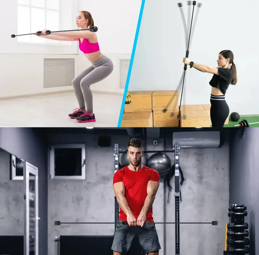 ENTRENAMIENTO MEDIANTE VIBRACIÓN: 🌀 Al agitar la barra, las oscilaciones se transmiten a todo tu cuerpo. Esto no solo quema calorías, sino que fortalece los músculos estabilizadores de la columna, el abdomen (core) y los brazos.